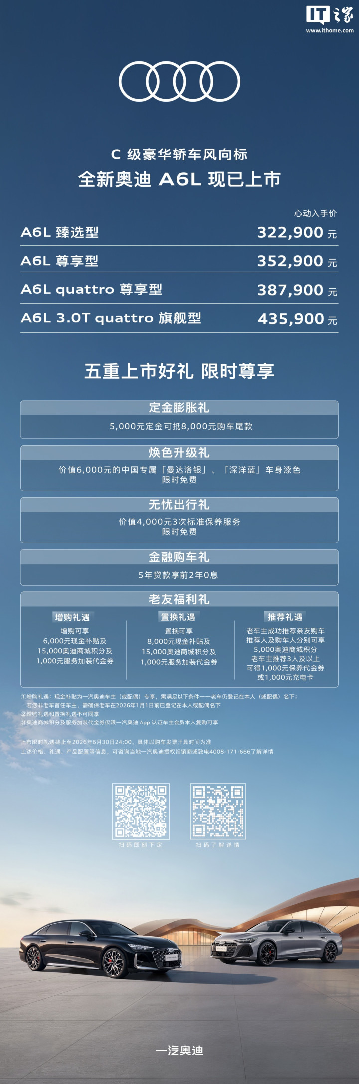 IT之家3月25日音信,全新奥迪A6L已上市。新车共推出4款车型,官方教唆价为32.29-43.59万元,并同步推出多项购车权力。