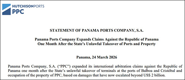 巴拿马口岸公司指出,这一数字源于巴拿马政府的一系列活动,包括不对法罗致巴尔博亚港、克里斯托瓦尔港两个货柜船埠、扣押私有及受法律保护的文献,以及⼀系列干系欠妥⾏为,对巴拿马口岸公司的打压活动“已抓续逾⼀年,并不休升级”。