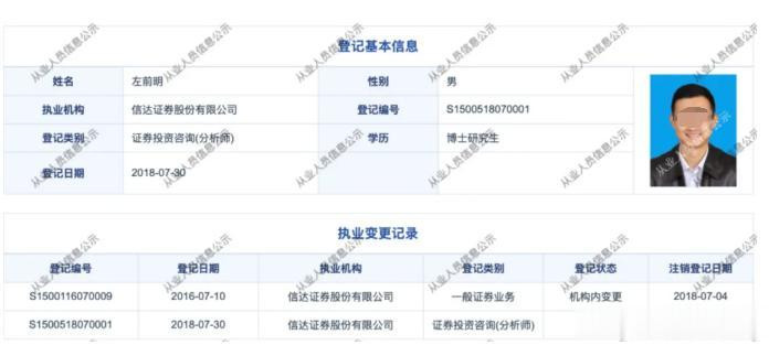 中证协官网府上清晰,左前明的执业登记机构登记为信达证券,登记类别为一般证券业务。2018年7月30日,左前明在信达证券的登记类别变更为证券投资扣问(分析师)。法例发稿,左前明在信达证券的登记景色仍清晰平时。