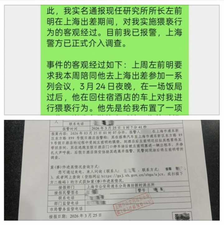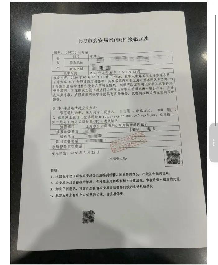 与举报信同步流传的,是一张上海市公安局浦东分局潍坊新村派出所出具的《案(事)件接报回执》,编号清晰为2026年。回执记录:报警东谈主唐婵玉于2026年3月25日凌晨1时7分41秒报警,称在搭车赶赴浦东新区东方路899号沐日旅社途中遭左前明猥亵,到店后对方握续拉扯欲将其带回房间,其在旅社门口泊车场被塞入出租车后抗争呼救,后由沐日旅社保安协助离开并报警,民警到场后将左前明带走造访。回执所载东谈主名、地方、事由与举报信高度吻合。