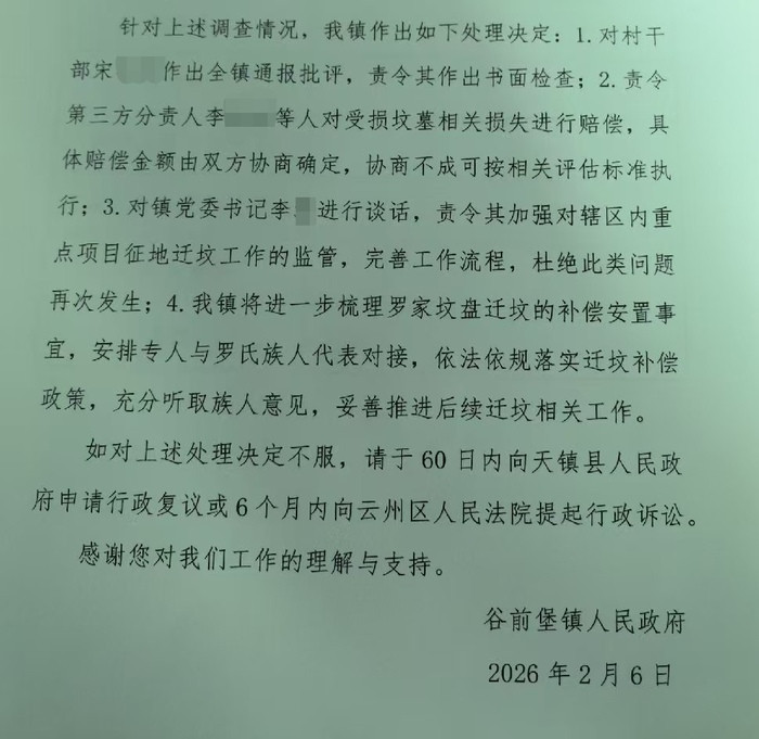 决定书称,经查,村干部宋某某在迁坟责任中,虽前期开展了疏导见知责任,但在未与罗家后东谈主就迁坟细节杀青最终一致的情况下组织迁坟,托福第三方现场施工,形成祖坟受损,存在责任行径毛糙的问题;第三方包袱东谈主李某某等东谈主在施工中操作失当,形成实质毁伤,仍是承担相应包袱,受到公安机关15日行政拘留;谷前堡镇党委文牍李某对迁坟责任的后续推普及履监管有所逐渐,并非“推诿监管包袱、包庇放浪”。