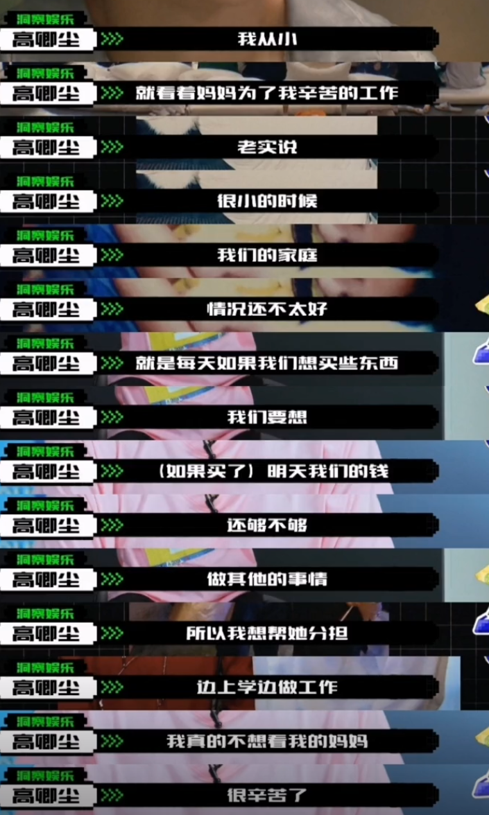 高卿尘年幼时父母仳离,自小和姐姐由母亲带大,高卿尘曾在节目中提到,之前家庭拮据,母亲养大两个孩子很艰辛,等我方赢利了,思帮母亲摊派。