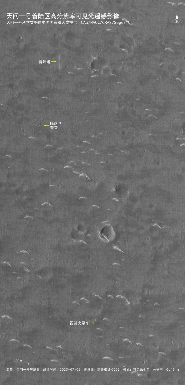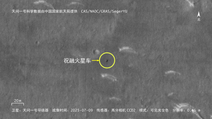 我国回禄号火星车有最新相片了!凭据中国国度航天局(CNSA)公布的新一批科学数据,天问一号轨谈器的高分离率相机在2025年7月,对回禄号所在的区域进行了一次成像,拍摄到了当今为止已知最新的回禄号相片。