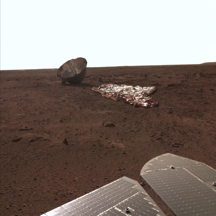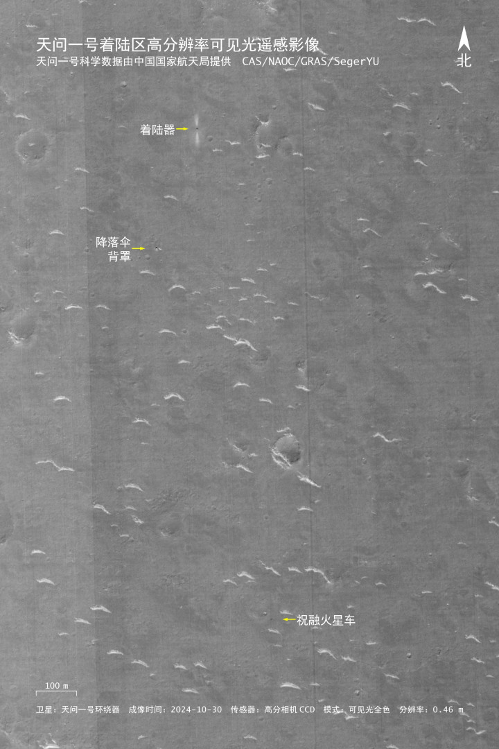 从分离率可达0.46米的新相片中,不错看到着陆器、降落伞和背罩,同期还有让大家最为惦念的回禄号火星车。回禄号曾在火星名义上留住的车轮印,如今还是看不出来了。