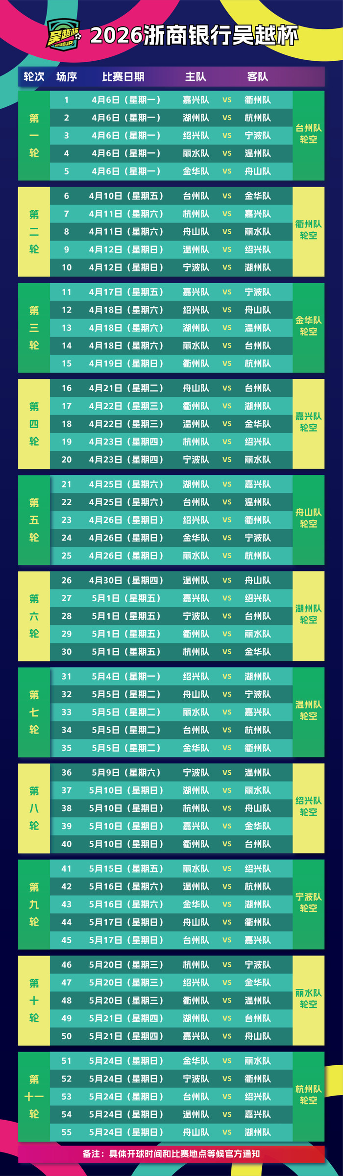 揭幕战将于4月6日在嘉兴举行,由嘉兴队主场迎战衢州队,打响“吴越杯”第一枪。本日,首轮其余5场比赛对阵场地为:嘉兴VS衢州、湖州VS杭州、绍兴VS宁波、丽水VS温州、金华VS舟山。