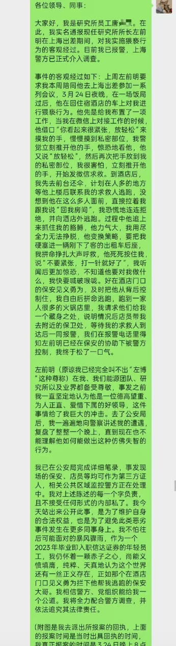 网传信达证券(601059.SH)计划所长处、动力首席分析师左前明,被其下属报警指控存在猥亵步履,涉事下属已在微信使命群公开事件细节,明确暗意已通过法律蹊径保重本人权柄。