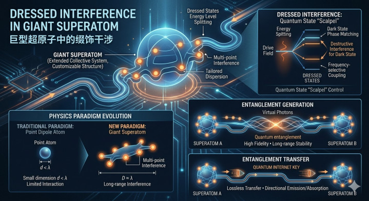 在量子光学参议的传统范式中,原子频繁被视为“点状”的偶极子。关联词,跟着超导量子电路和冷原子物理的发展,“巨型原子”(Giant Atoms)的看法冲突了这种空间局限性。2025年发表于《物理斟酌快报》(PRL)的论文《Dressed Interference in Giant Superatoms: Entanglement Generation and Transfer》,由 Lei Du 和 Anton Frisk Kockum 等学者建议,进一步将这一看法推向了“巨型超原子”的高度,并揭示了一种全新的量子态操控机制:缀饰干预(Dressed Interference)。