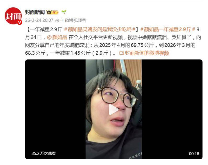 据3月24日晚间报说念,颜如晶在个东说念主酬酢平台发布的一条视频,让多数正在减肥路上扞拒的网友破了大防。视频里,她鼻子哭得通红,含泪向粉丝申报我方已往一年的“战绩”:从2025年4月的69.75公斤,到2026年3月的68.3公斤,整整一年,体重仅下落1.45公斤(2.9斤)。