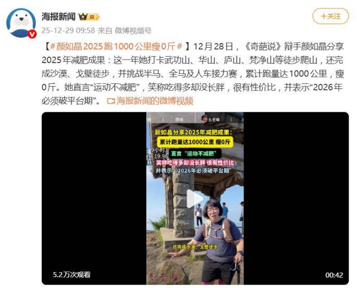 这组数字一出来,挑剔区短暂成了大型“东说念主间着实”现场。要知说念,颜如晶这一年的畅通量,号称“地狱级”。把柄她我方的记载,2025年全年,她累计跑步逾越1000公里,完成了包括攀高武功山、华山、沙漠戈壁徒步、2场Hyrox高强度健身赛事,甚而还挑战了半程马拉松、全程马拉松以及一场长达142.7公里的东说念主车戮力赛。